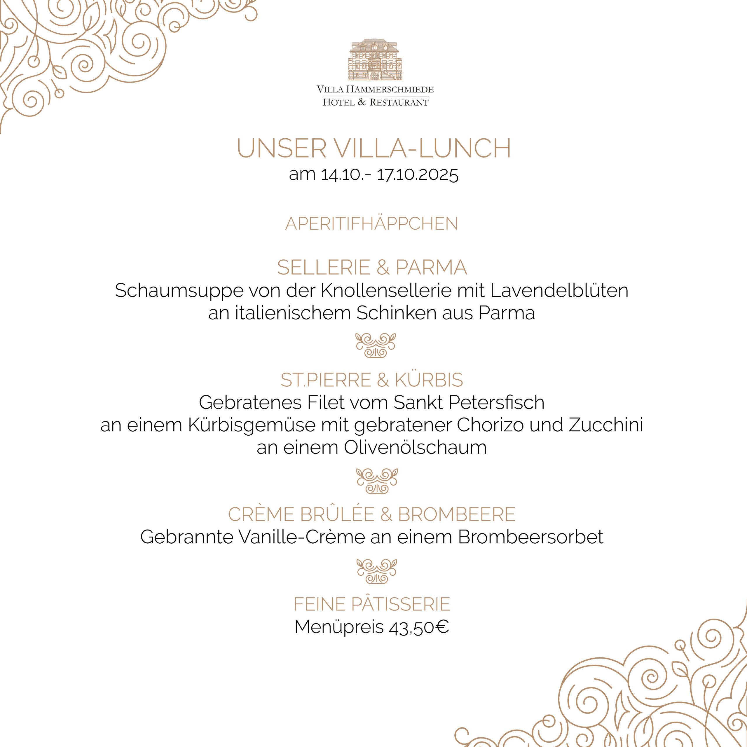 Unser „Villa Lunch“ können Sie von Dienstag bis Freitag jeden Mittag in der gemütlichen „Guten Stuben“, sowie im licht-durchfluteten Pavillon oder bei gutem Wetter auf unserer herrlichen Terrasse genießen.