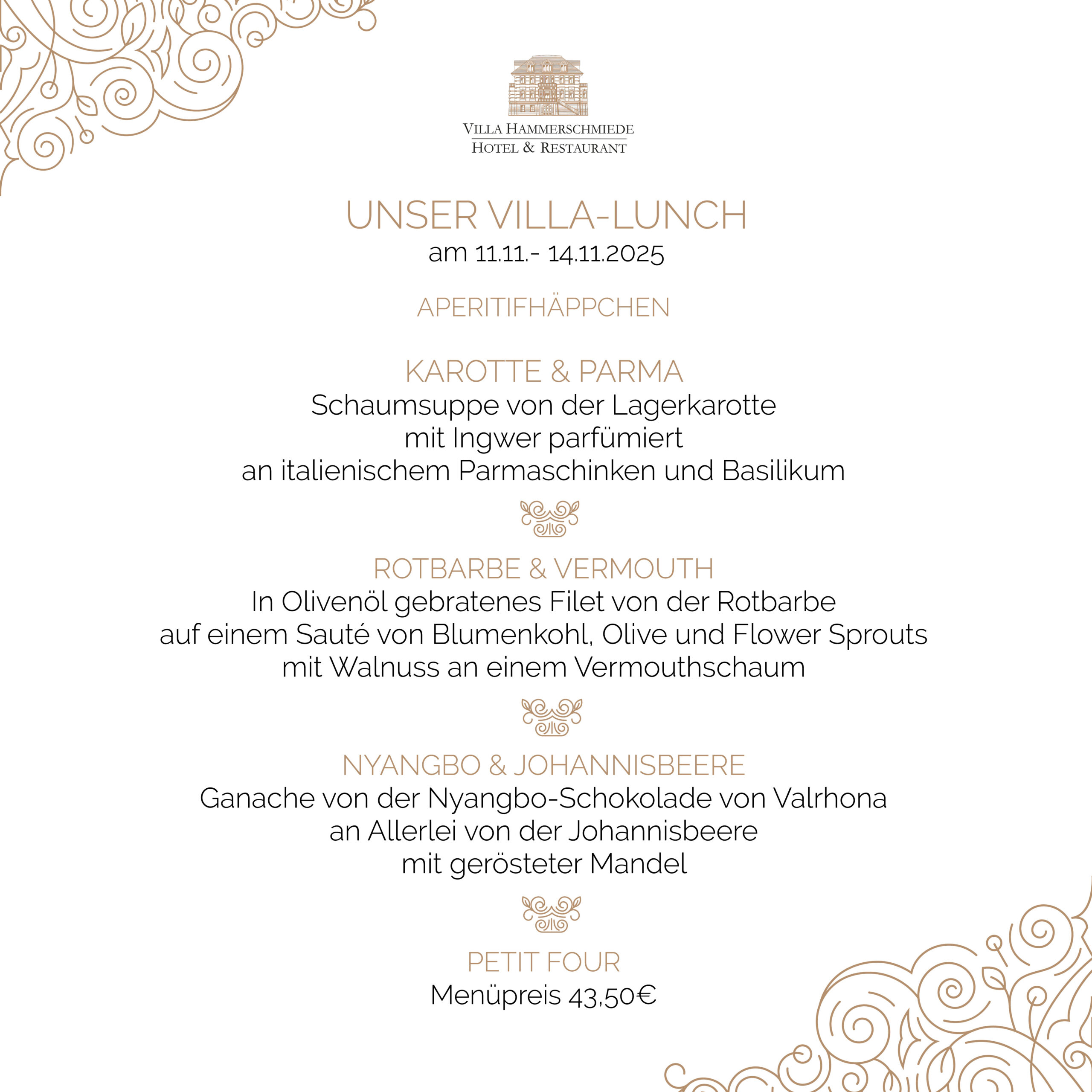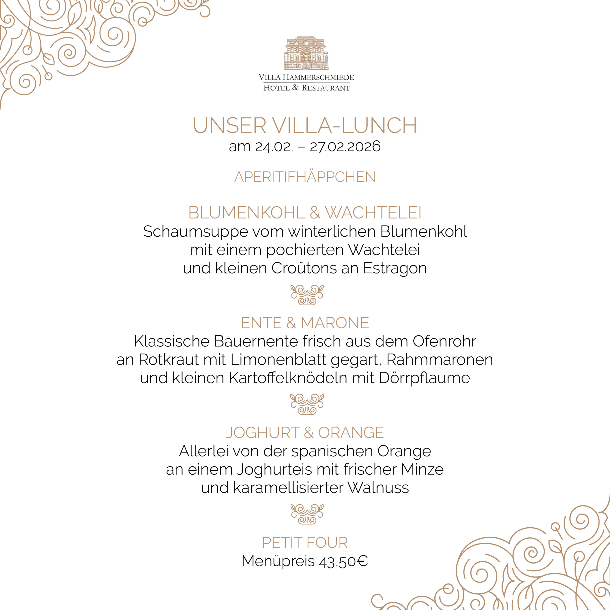 Vorspeise, Hauptgang und Dessert zum Preis von 43,50 €.