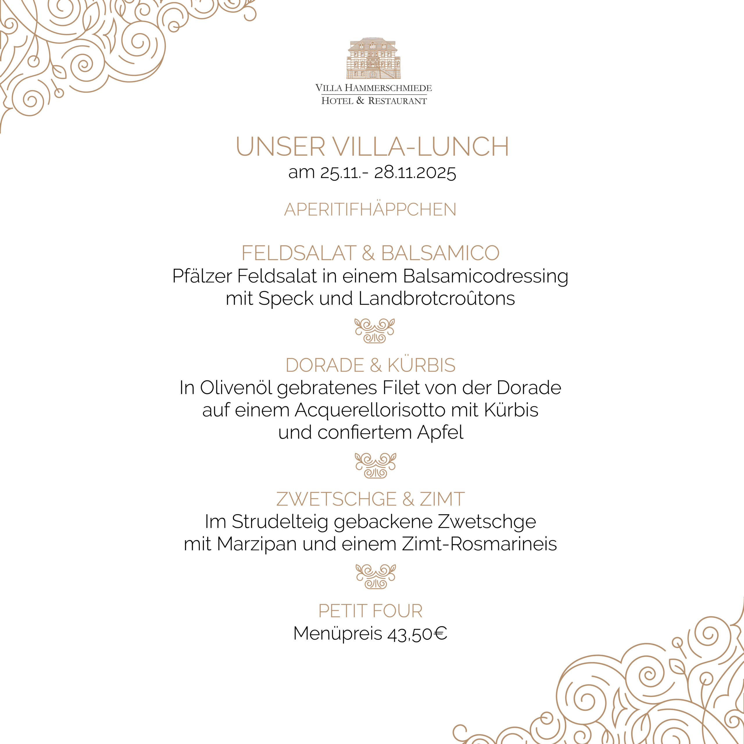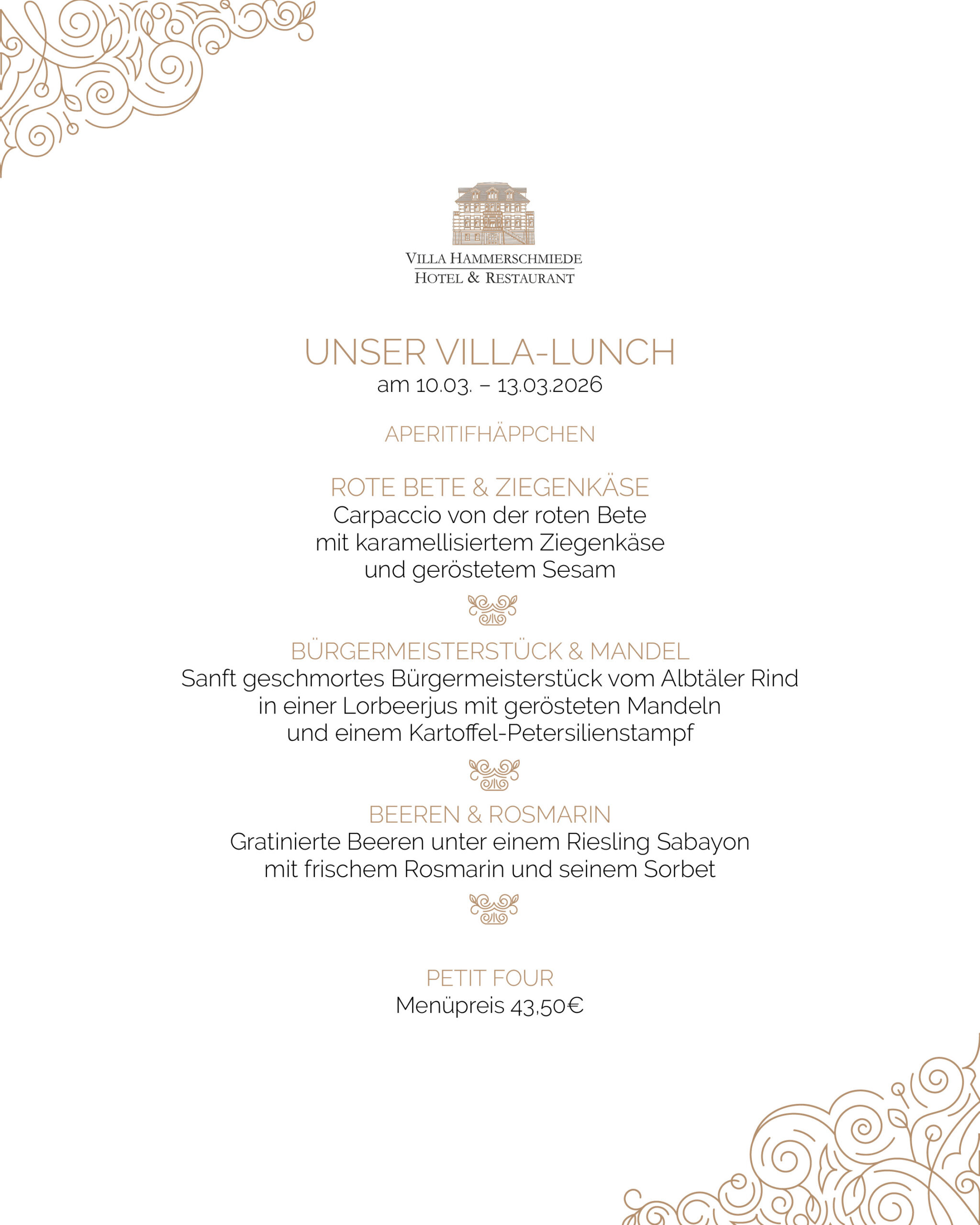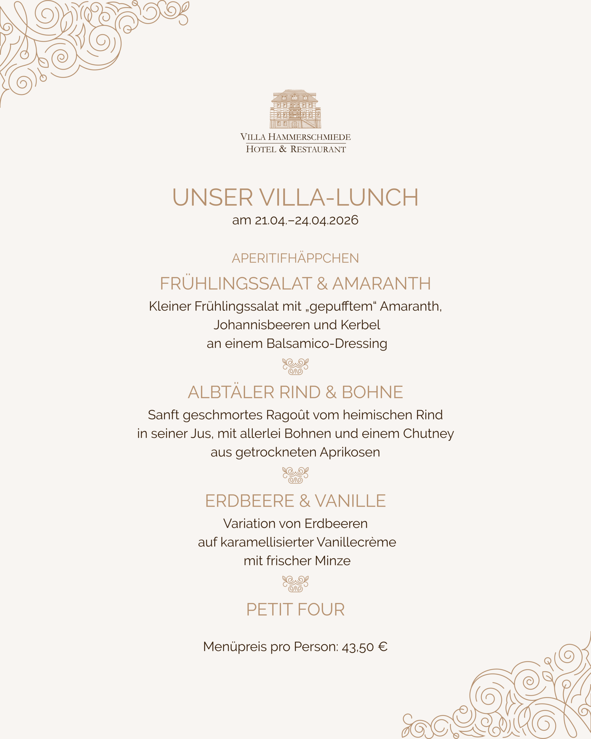 Unser „Villa Lunch“ können Sie von Dienstag bis Freitag jeden Mittag in der gemütlichen „Guten Stuben“, sowie im licht-durchfluteten Pavillon oder bei gutem Wetter auf unserer herrlichen Terrasse genießen.
