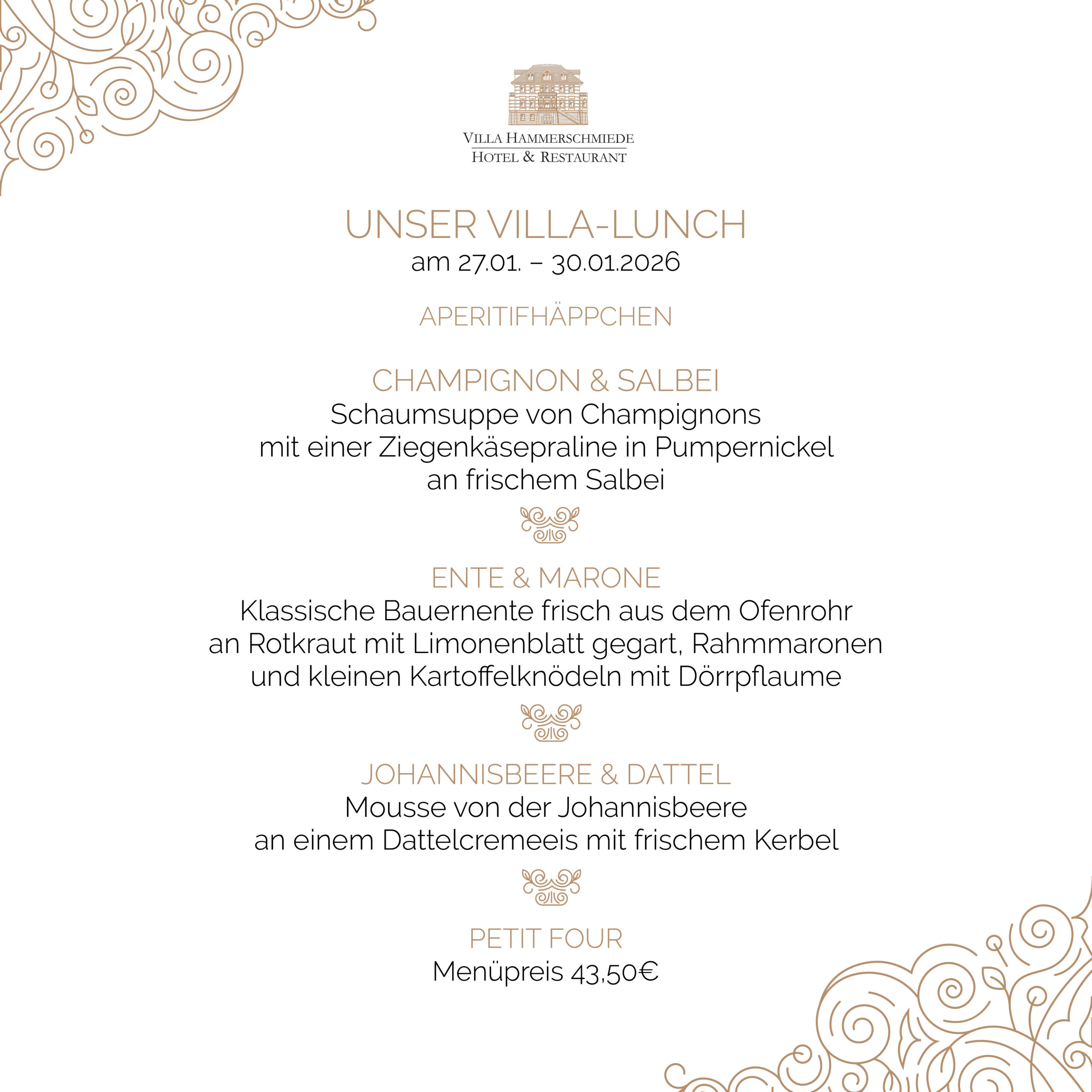 Leider können wir im Moment unseren „Villa Lunch“ nicht anbieten. Das tut uns natürlich sehr Leid und wir hoffen Sie bald wieder zu unserem „Villa Lunch“ begrüßen zu dürfen.